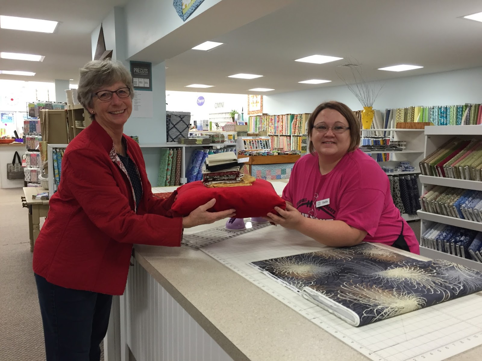When we came into one of the shops, there was a life-size cardboard cutout of the quilting maven. We asked the cashier if she could take a picture of us with Jenny, as we pointed to the cardboard cutout. Little did we know, but the real Jenny was in the back. She was more than happy to chat with us and get a picture taken.