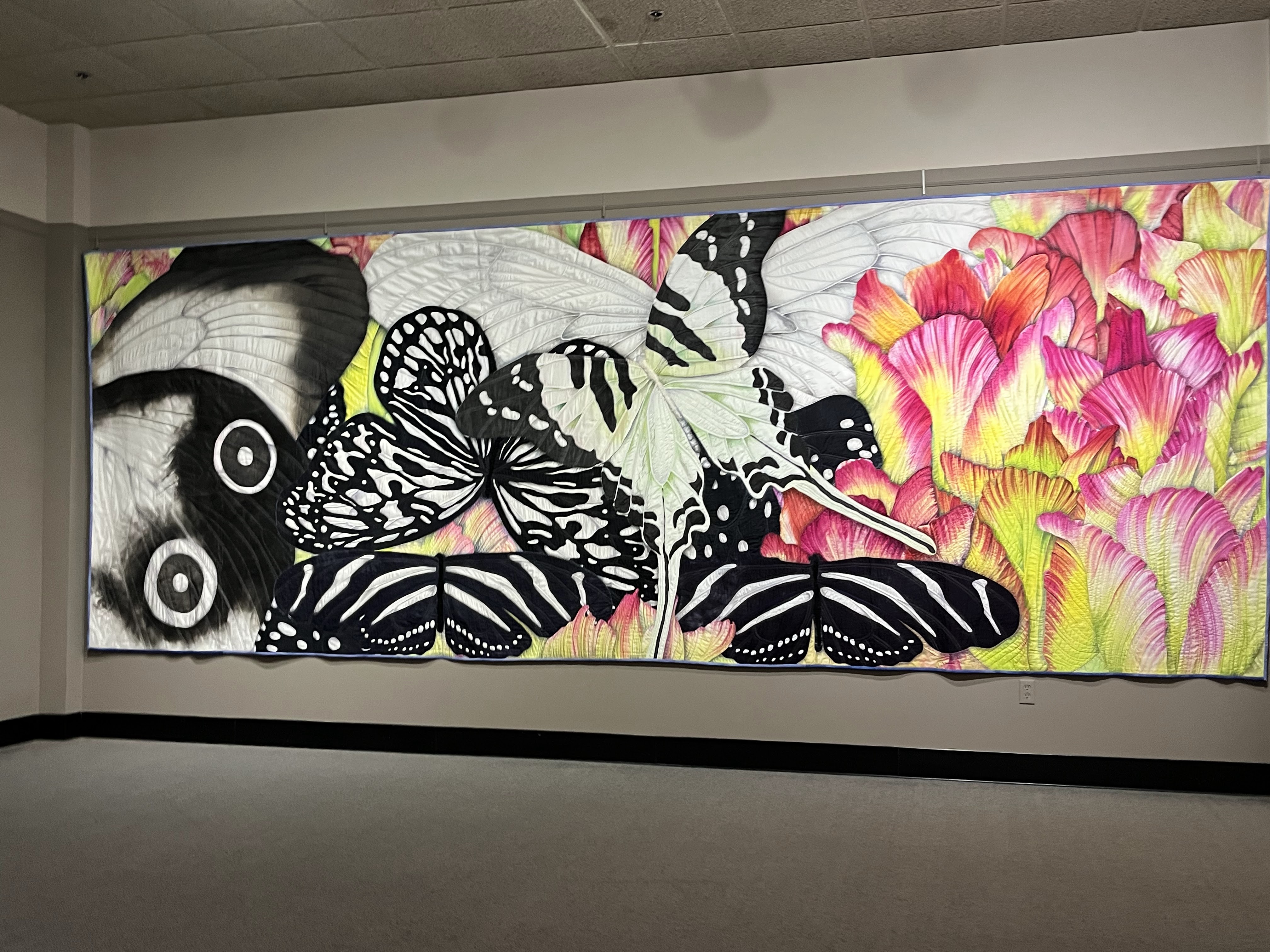 Marilyn Badger created the quilts above. She puts a lot of embellishments on her quilts, including buttons, pearl beads, hand embroidery and sparkly gems. Her quilting created lots of texture. I loved the shaped borders of the green and red quilt. Another collection included "larger than life" quilts by Velda Newman. Her quilts were 15-20' across and 7 or 8' tall. For most of the quilts she painted flowers, and then used thread painting to enhance them.