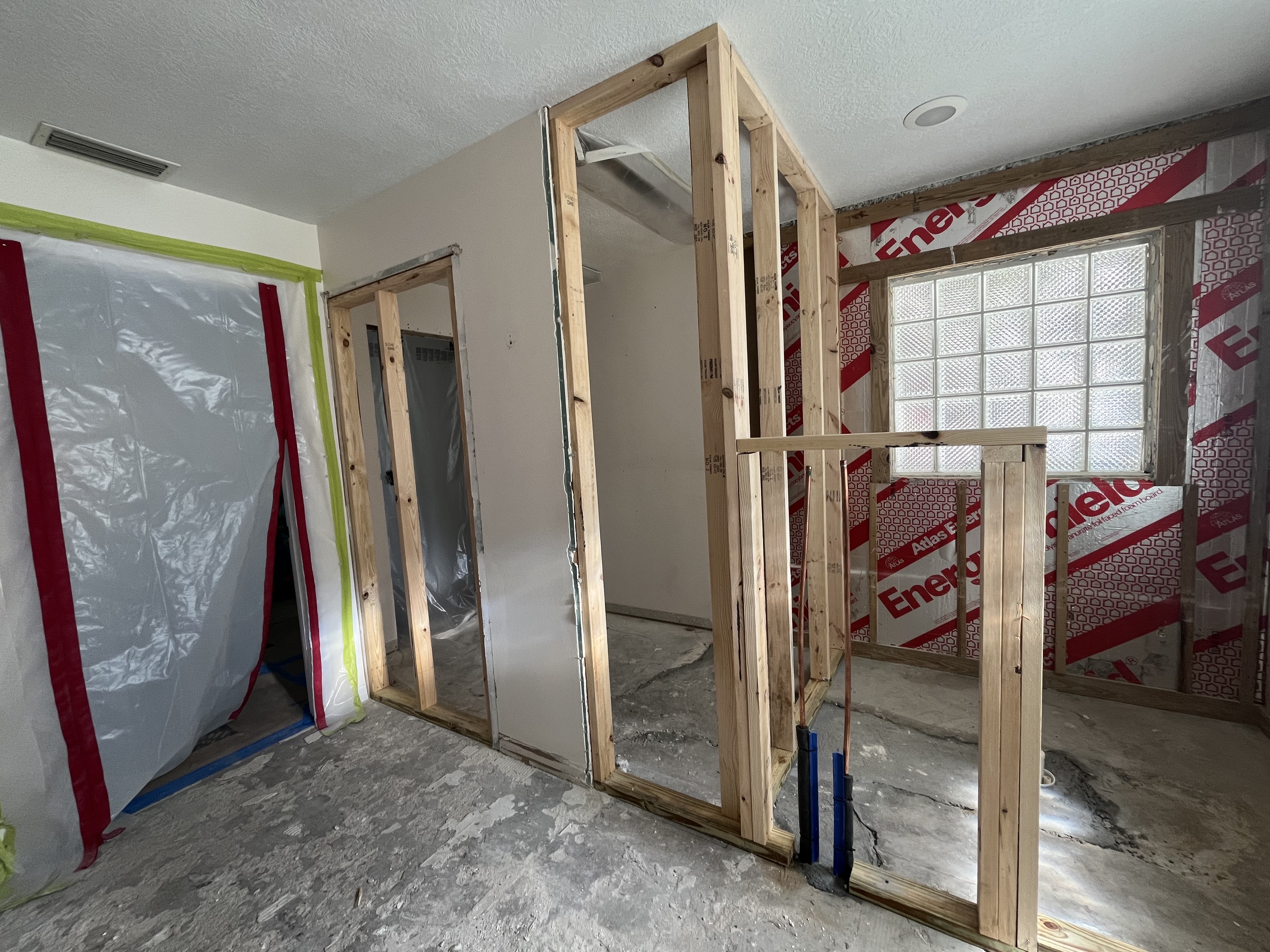 The carpenter built a new wall to extend our closet a smidge, and changed the door from entering the closet from the bathroom to entering from the bedroom.